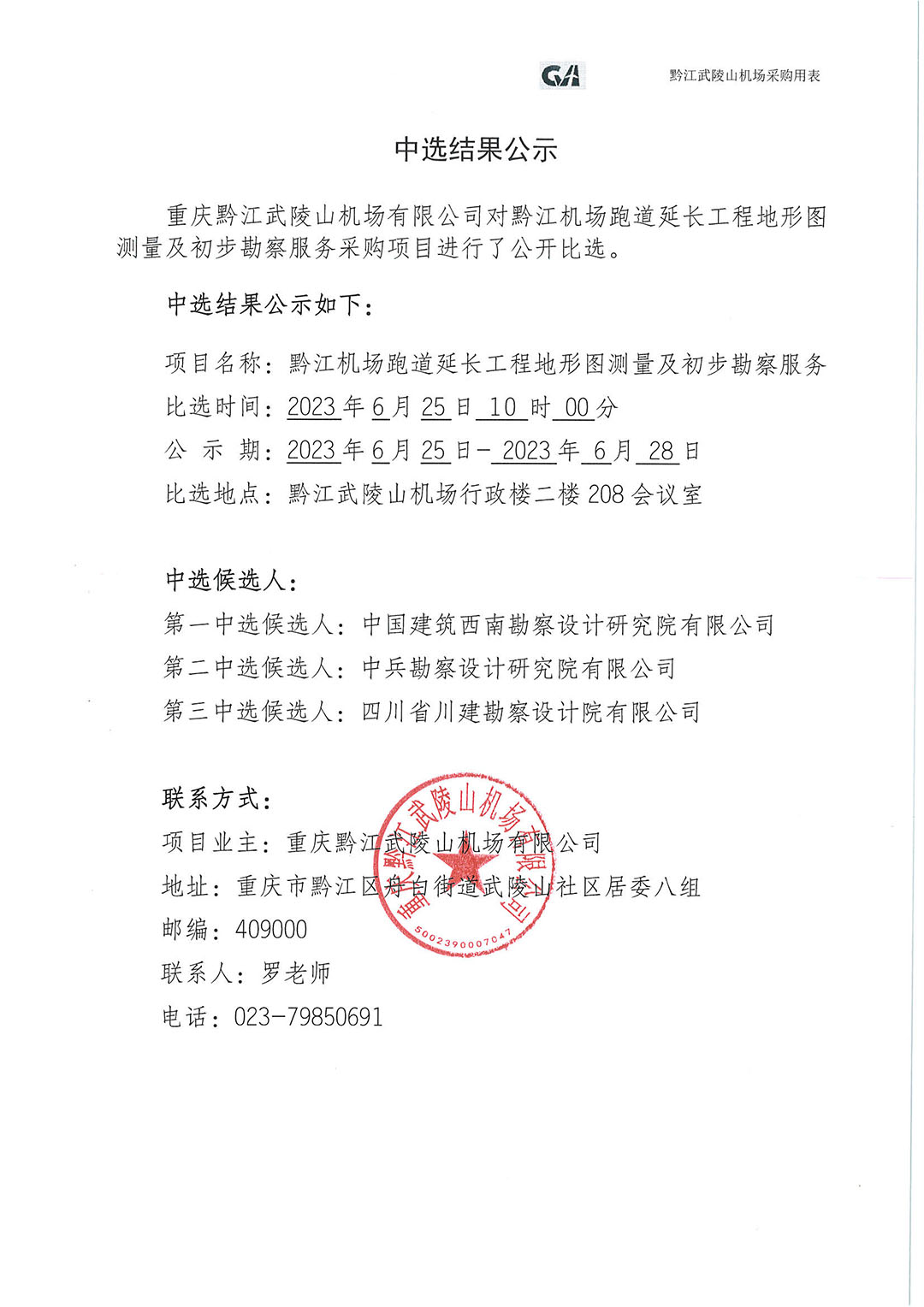 黔江機場跑道延長工程地形圖測量及初步勘察服務中選結果公示