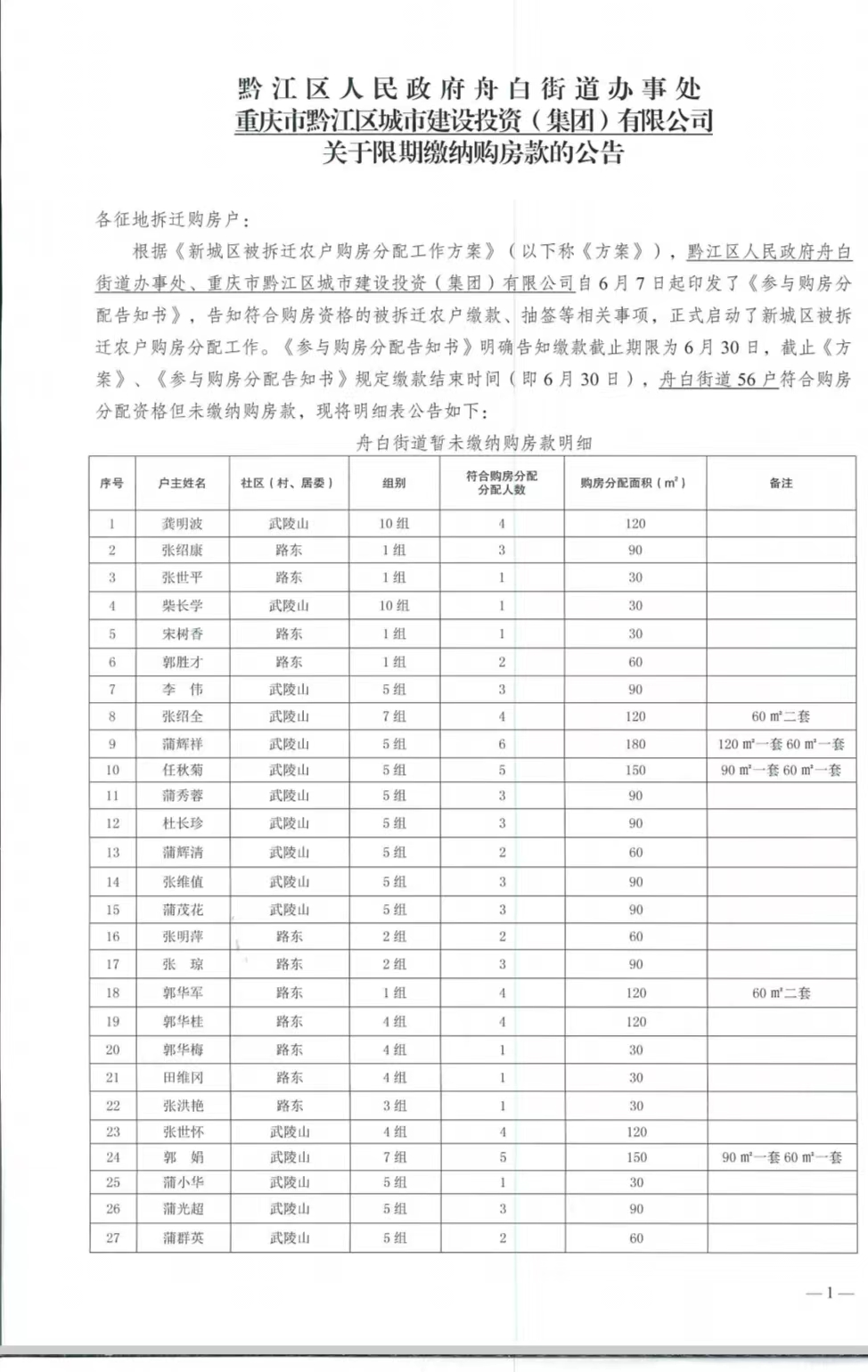黔江區(qū)人民政府舟白街道辦事處重慶市黔江區(qū)城市建設(shè)投資(集團(tuán))有限公司關(guān)于限期繳納購房款的公告