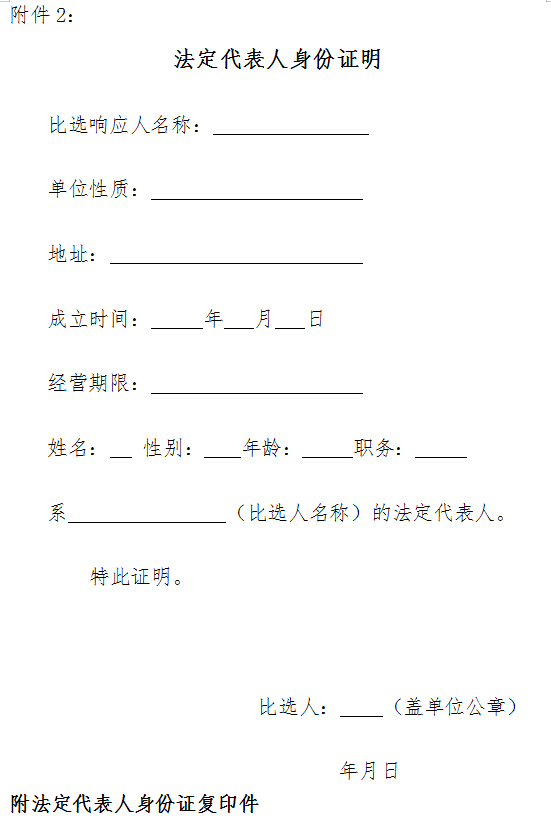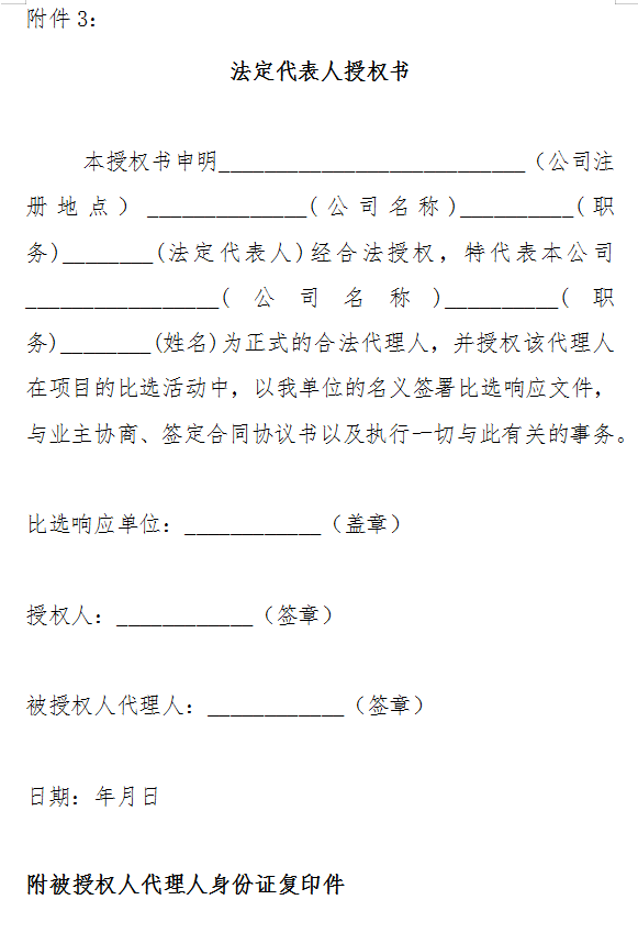 5.5 比選會各比選響應人須至現場參加。參加比選會的比選響應人的法定代表人或其授權的代理人應當隨身攜帶本人身份證(原件),授權的代理人還應當隨身攜帶法定代表人授權委托書(原件),以備核驗其合法身份。