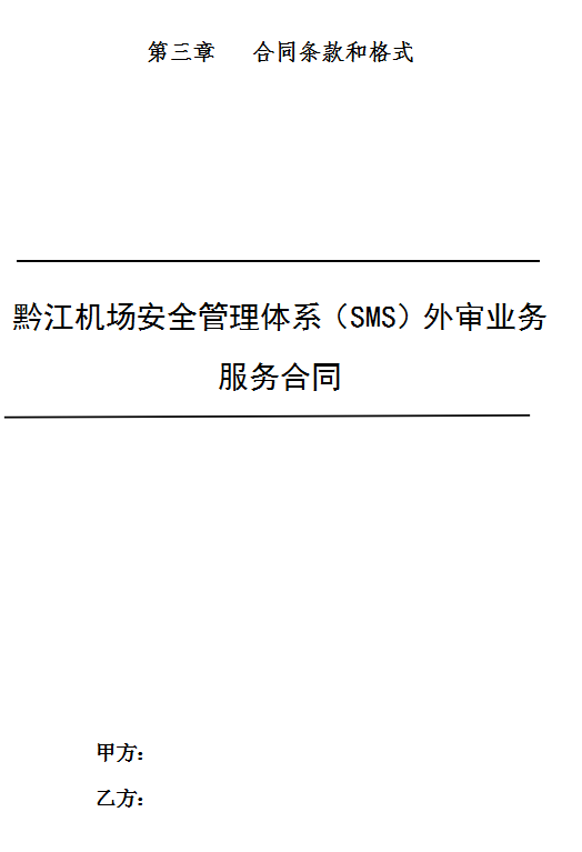 1.2審核服務的方式:乙方應通過擬定黔江機場安全管理體系(SMS)審核計劃、審核檢查單、SMS所有要素的文件審核和現場審核、編寫審核總報告和分報告 的方式開展審核服務工作。