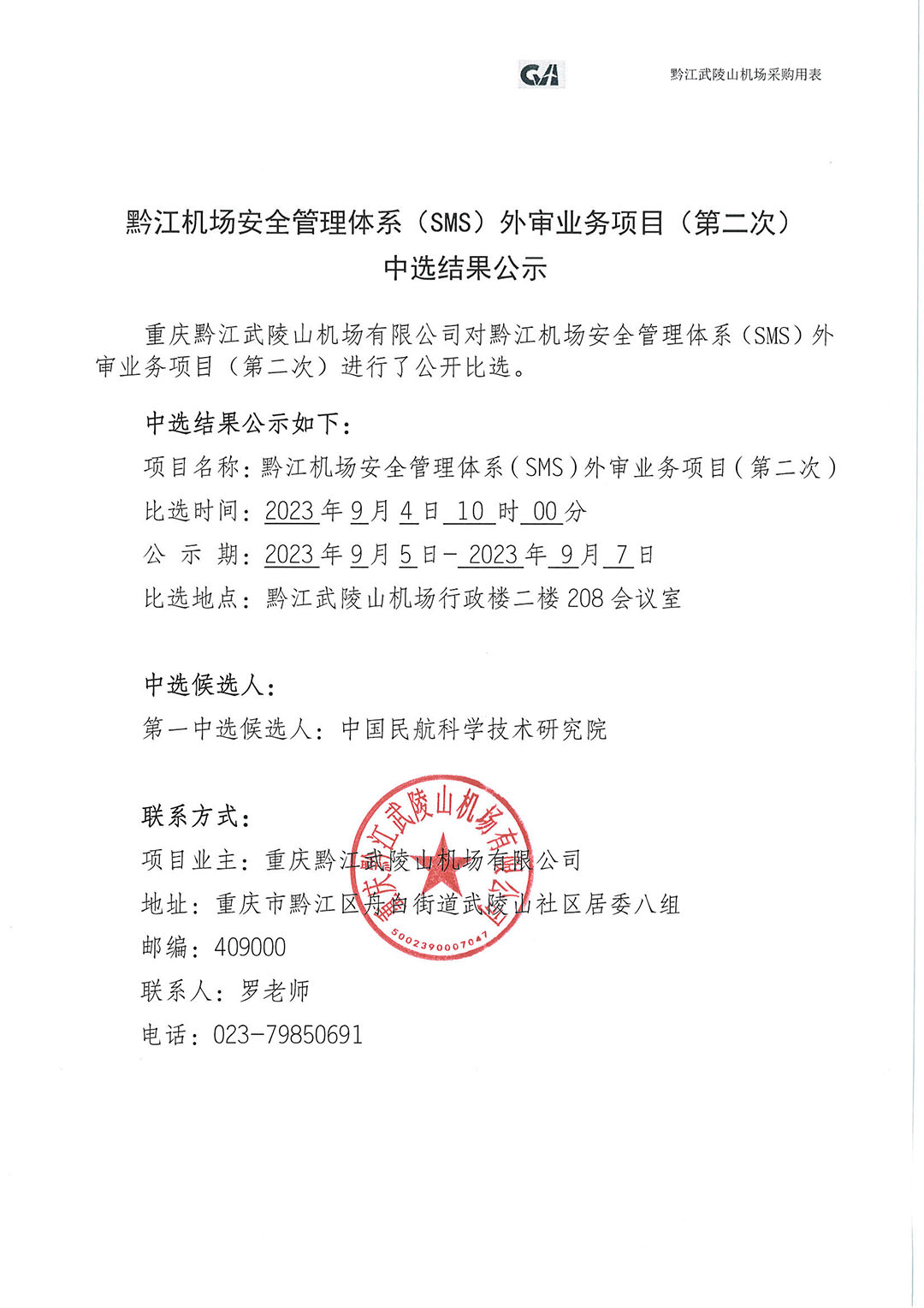 黔江機場安全管理體系(SMS)外審業務項目(第二次)中選結果公示