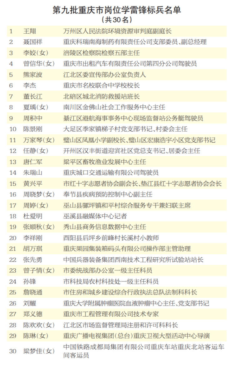 為激勵先進,樹立典型,市委宣傳部決定命名渝中區“水電氣訊”紅巖先鋒聯合服務隊等30個單位為第九批重慶市崗位學雷鋒示范點,王翔等30名個人為第九批重慶市崗位學雷鋒標兵,并希望全市崗位學雷鋒示范點和崗位學雷鋒標兵珍惜榮譽、再接再厲,努力在培育巴渝新風新貌方面發揮更好示范帶動作用,在社會主義現代化新重慶建設中再立新功。
