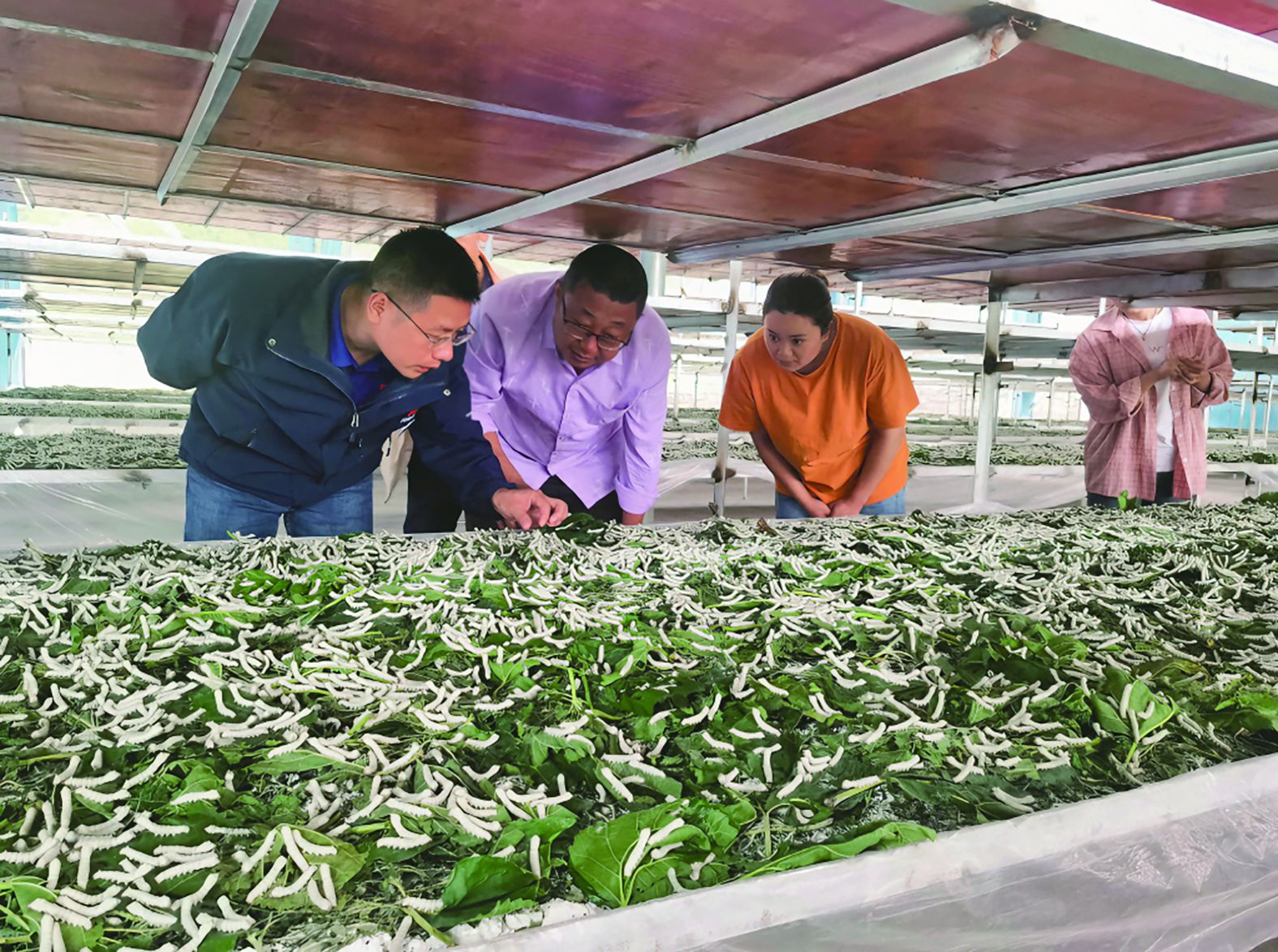 ▲汪文銳(中)與科技特派員一起查看蠶兒長勢(資料圖片)