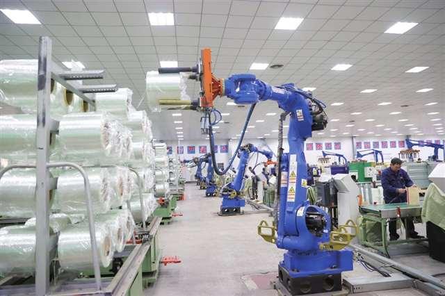 ▲在黔江區(qū)工業(yè)園區(qū)三磊玻纖公司生產(chǎn)車間,工業(yè)機(jī)器人在搬運(yùn)玻纖產(chǎn)品。攝/楊敏