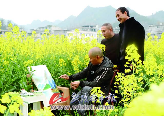 附近的村民來到油菜花田觀看李遠畫畫