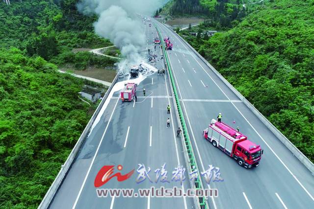 執法人員協助高速交巡警快速完成現場管制,根據救援需要立即聯合消防等部門合力處置隱患。經多方通力合作,明火于13時20分撲滅,險情得到控制,有效減輕了火燒車輛對路面及附屬設施的損壞。13時50分許現場清理滿足通行條件,正線管制解除,第一車道恢復通行。在現場散落物清除完畢確定無安全隱患后,執法人員利用科無人機和測量設備對事故路產損壞情況進行勘驗。