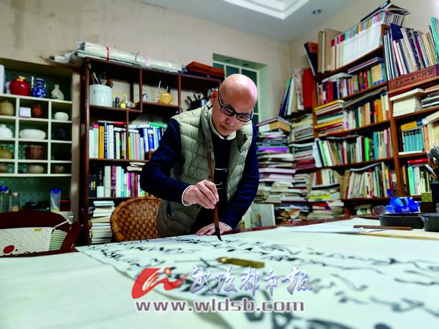 走進(jìn)鄒澤的書房,心頭跳出一句“春風(fēng)大雅能融物,秋水文章不染塵”。鄒澤不光是書法家,而且文史哲多項全能,但見整面墻的書柜上滿滿當(dāng)當(dāng)?shù)牟貢龝ㄈ膺€有大量文史類書籍。遠(yuǎn)離浮躁和世俗,耐得住寂寞,是書家境界。鄒澤飽讀詩書,又潛心書藝,書房是方寸之地,卻是他無垠的精神領(lǐng)域。