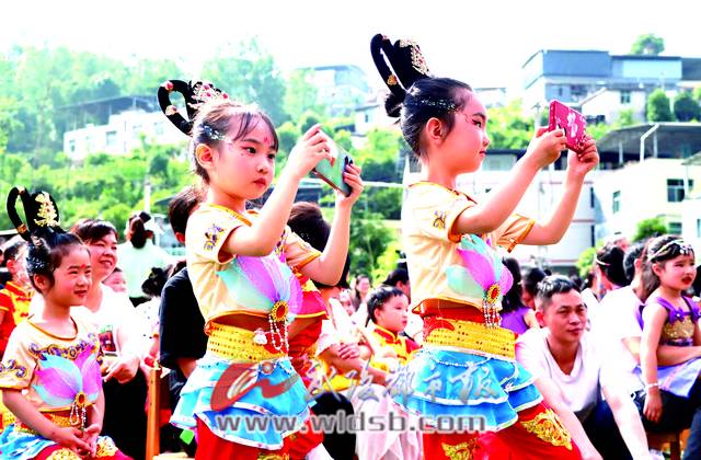 身著表演服裝的城東小學中心幼兒園孩子,拿著家長的手機為臺上演出的同學拍照