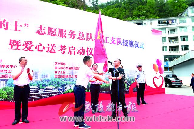 6月6日,重慶市“雷鋒的士”志愿服務總隊黔江支隊授旗儀式暨愛心送考啟動儀式在黔江汽車客運西站舉行。重慶市道路運輸事務中心出租汽車處處長、重慶市“雷鋒的士”志愿服務總隊副總隊長王偉宣讀組建重慶市“雷鋒的士”服務志愿總隊黔江支隊批復文件,并向“雷鋒的士”黔江支隊授旗。