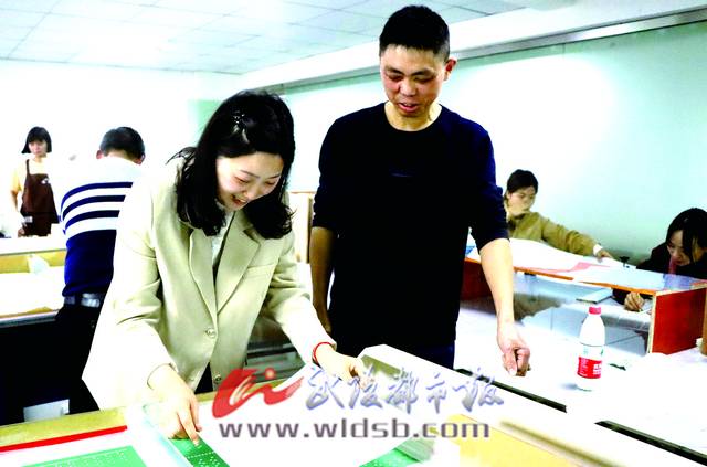 李江華指導(dǎo)工人將篩選好的珠子粘貼在膠紙上
