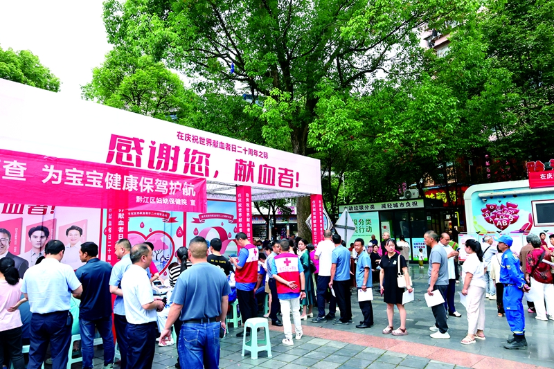 本報訊(記者 王安娜 文/圖)“獻血有益健康,每次獻完血我都覺得很開心,今天更有意義?!?月14日,早早趕來獻血的市民陳人才拿到無償獻血證后激動地說。為感謝支持無償獻血公益事業的市民,同時鼓勵更多市民朋友加入公益行動,當天,黔江區紅十字會、黔江中心血站在紅軍廣場聯合開展“世界獻血者日”20周年慶祝活動,吸引了無數過往群眾參與。