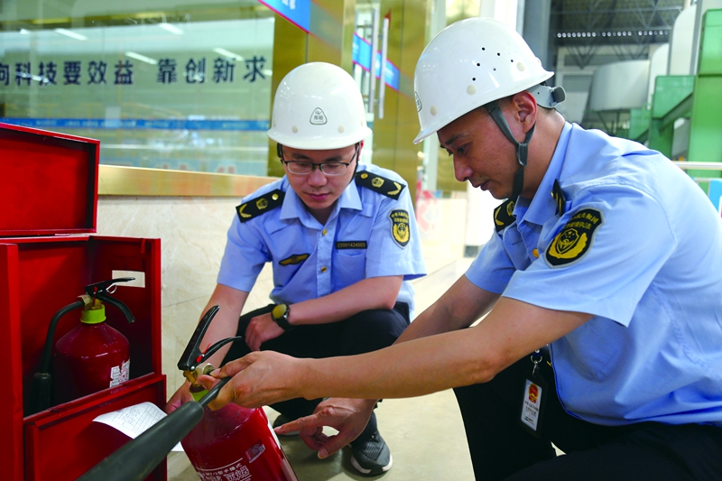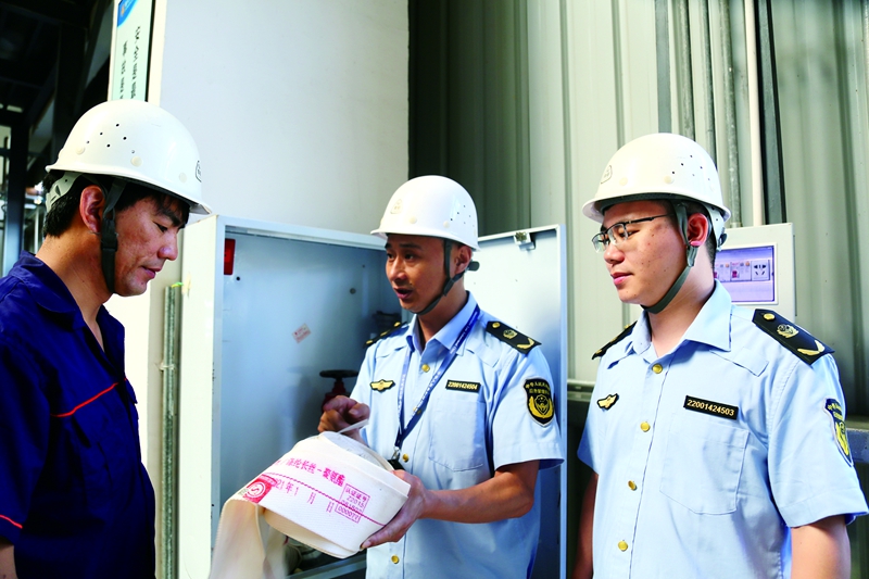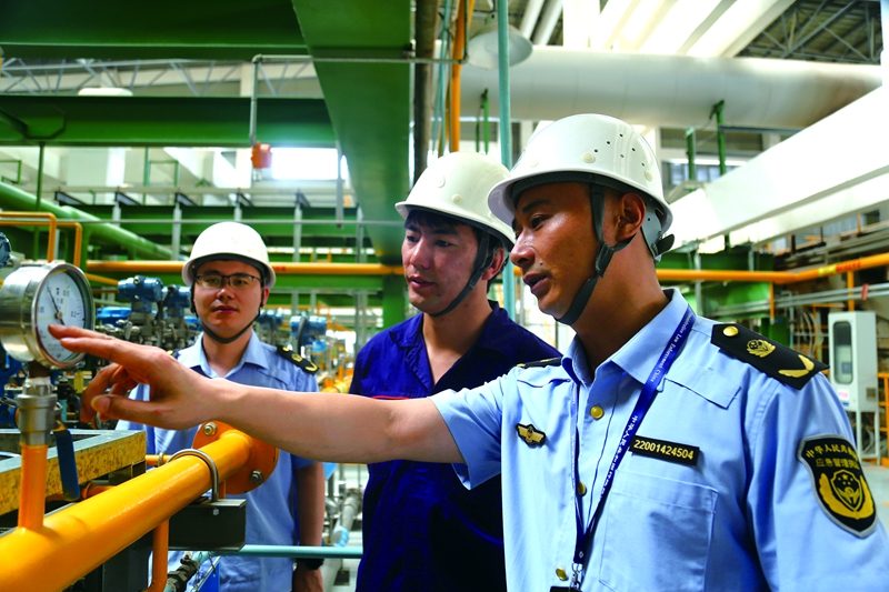 石隱義(右一)與廠區(qū)工作人員檢查壓力表。