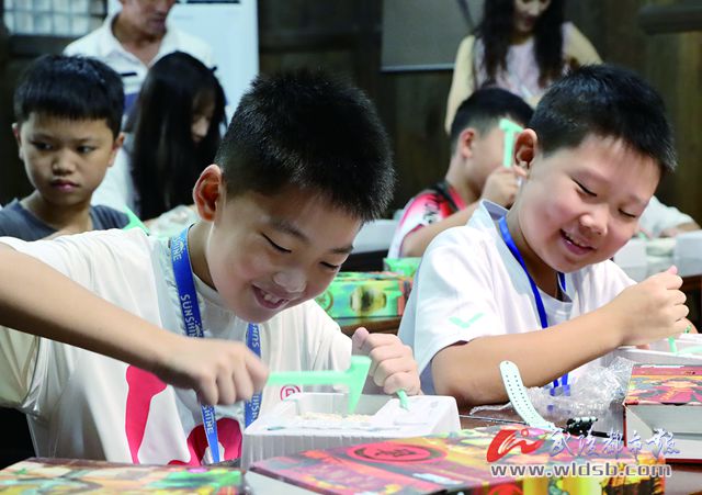 在黔江區三臺書院非遺文化大廳,老師將挖掘方法采用PPT形式進行詳細講解后,孩子們便迫不及待地打開手中的模擬文物,用各種考古小工具進行敲、打、鑿、刷等,將模擬文物中的銅馬、彩象、銅樽、銅鼎、陶罐等器物挖掘出后,臉上綻放出開心的笑容。