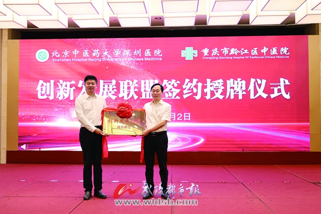 本報訊(記者 劉旭東 文/圖)8月2日,北京中醫藥大學深圳醫院與黔江區中醫院創新發展聯盟簽約授牌儀式在黔江區舉行。北京中醫藥大學深圳醫院黨委書記胡世平、黨委委員陳國姿,以及相關處科室負責人、專家教授;黔江中心醫院、區婦幼保健院和全區30個基層醫療機構相關負責人,區中醫院中層及以上干部共計百余人參加簽約授牌儀式。