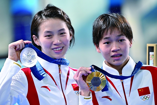 全紅嬋(右)和陳芋汐展示獎(jiǎng)牌