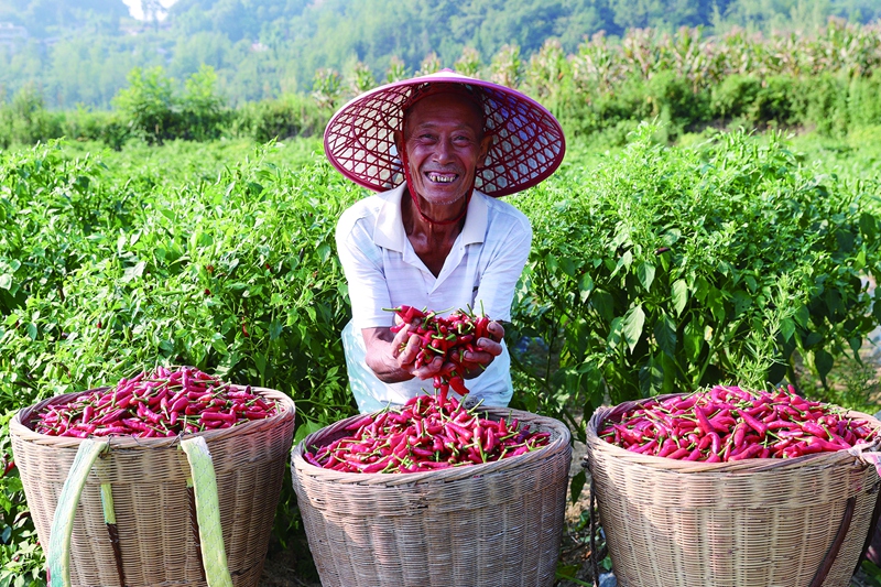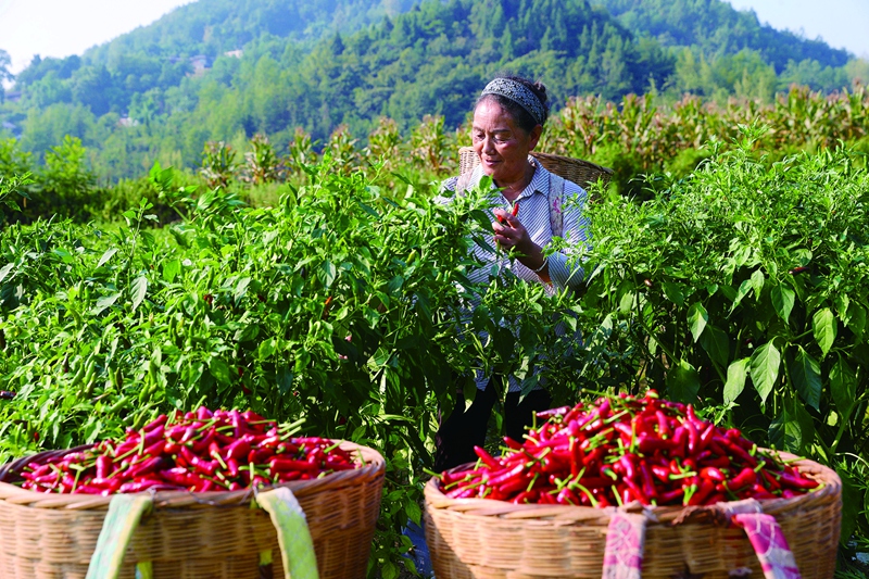 近日,村民和志愿者在黔江區水田鄉石郎村辣椒種植基地采摘辣椒。