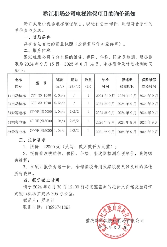 黔江機(jī)場(chǎng)公司電梯維保項(xiàng)目的詢價(jià)通知