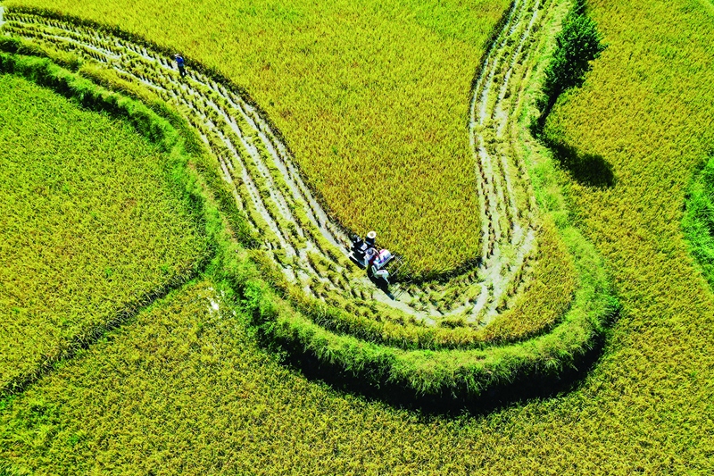 8月25日,黔江區黑溪鎮光明村村民操作小型收割機收割水稻。時下,黔江區15萬畝水稻相繼成熟,村民們頂著持續多日的高溫天氣,采用傳統手工打谷法和小型打谷機、大型收割機相結合的方式,搶收搶曬,確保顆粒歸倉,實現增收。