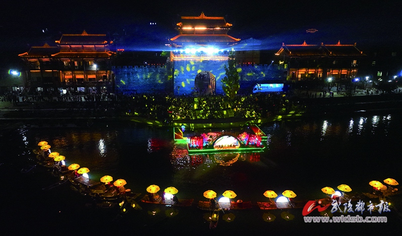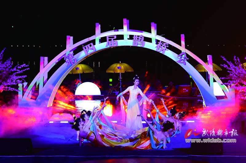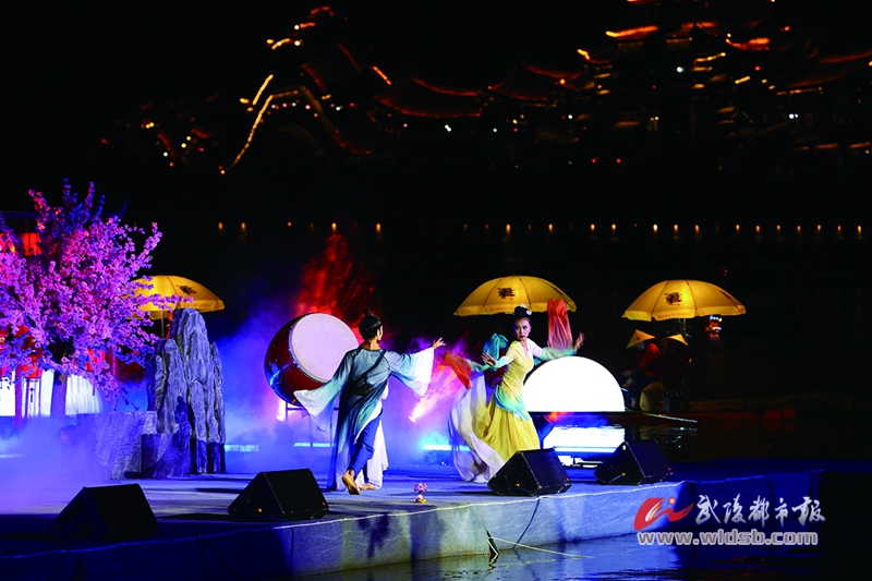 10月2日,國慶黃金周第二天,黔江區第四屆鵲橋會在夜幕下的濯水古鎮阿蓬江上開幕。演員們在搭建在阿蓬江上的舞臺上,表演了豐富多彩的文藝節目,演繹了一場夜幕下的水上文化盛宴,吸引了眾多游客前往觀賞。據悉,黔江區第四屆鵲橋會活動持續到5日,其間舉辦了水上歌舞、千帆競渡、鵲橋相會、花船巡游等水上活動。 (圖片均為鵲橋會活動上的文藝節目表演)