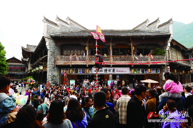 10月5日,游客在濯水古鎮(zhèn)觀看民間藝人表演非遺項目《上刀山》。