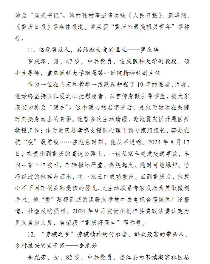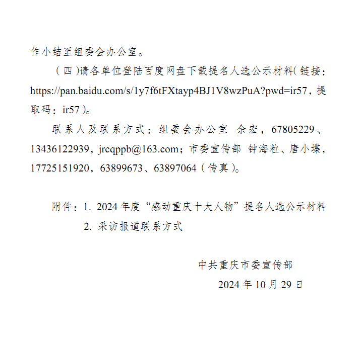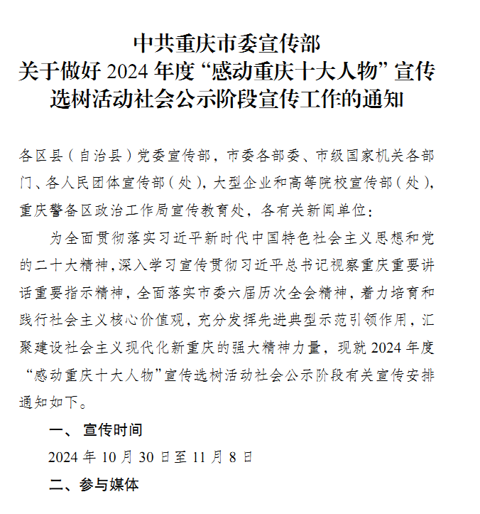 中共重慶市委宣傳部關于做好2024年度“感動重慶十大人物”宣傳選樹活動社會公示階段宣傳工作的通知