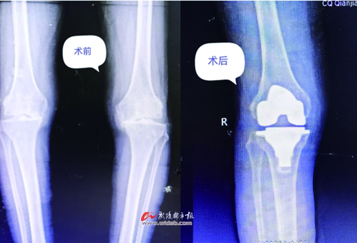 區中醫院骨科主任楊光海介紹,結合影像學診斷,病人膝關節內側間隙已經完全消失,提示軟骨已經磨損得非常嚴重,導致關節間隙變窄,屬于骨關節炎的終末期。