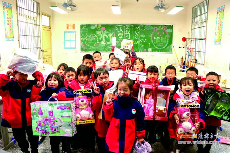漂亮的沖鋒衣、嶄新的童話書、可愛的洋娃娃,還有各種新式的文體用品、學習用具……這些禮物堆放在教室的正前方,在老師的帶領下,孩子們排著隊領到了屬于自己的個性禮包。大家捧著心愛的禮物,喜笑顏開。