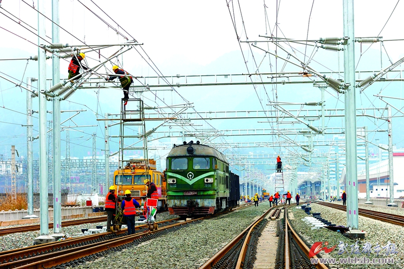 2月22日,工人在渝廈高鐵重慶至黔江段黔江站內安裝接觸網。為確保今年6月底建成通車,自渝廈高鐵重慶至黔江段開工建設以來,工人們放棄節假日,堅守建設工地,加班加點施工。目前,項目已進入靜態驗收階段。項目建成后,重慶主城至黔江區的時間將從現在的4小時縮短至1小時以內。 首席記者 楊敏 攝
