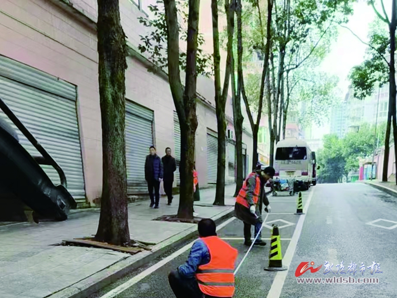 2月25日上午,記者在位于黔江區體育館路段的公共停車位路段看到,該路段停車位內的地磁檢測設備已經全部安裝完成,工作人員正在對地磁檢測設備進行測試。