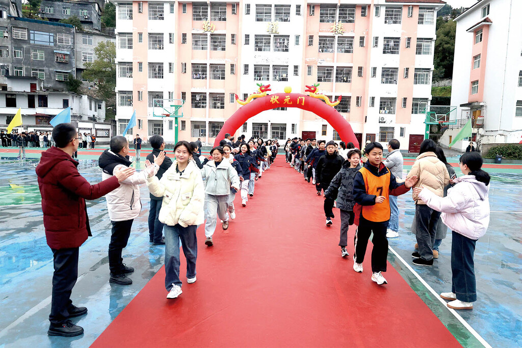 在狀元門下,初三年級組的全體教師早已等候在兩旁,用他們的笑容與掌聲,迎接即將走過狀元門的莘莘學子,祝愿他們在初三年級的最后百日沖刺中,奮力拼搏,用汗水助力奔跑,直通狀元門。