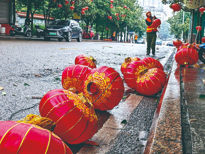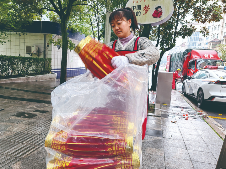 3月13日上午,記者在黔城大眾廣場附近看到,市政工人正借助專業工具小心翼翼地拆除樹梢上高高懸掛的燈籠,地面工作人員有條不紊地將燈籠折疊、堆放,最后依次入袋裝車,不到一個小時的工夫,原本“掛滿枝頭”的燈籠就被市政工人運走,封存入庫,待到來年“再攀枝頭”。