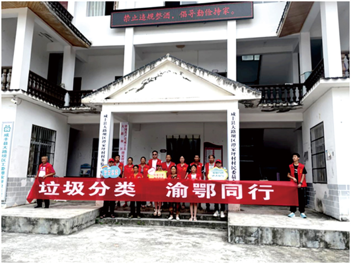 以黨建引領為紐帶,與毗鄰湖北省咸豐縣鎮村建立結對共建工作機制,發揮毗鄰區域樞紐作用。通過組織中塘鎮勝利村、咸豐縣唐崖鎮、大路壩區工委轄區的村(社區)開展支部主題黨日活動和黨員志愿服務共建等活動,建立起定期經驗交流機制,共商治理策略,推動兩地垃圾分類治理形成強大的合力。兩地充分利用紅色資源優勢,結合垃圾分類主題開展共建活動,常態化開展“黨建+”村(社區)宣傳、“黨建”+校園培育等活動,推動兩地垃圾分類工作互聯互動、雙向促進。并不定期組織雙方黨員干部深入開展聯學共學,共同組建青年黨員志愿服務隊,建立長效服務機制,定期開展垃圾分類宣傳活動,切實將結對共建合力轉化成垃圾分類治理能力。