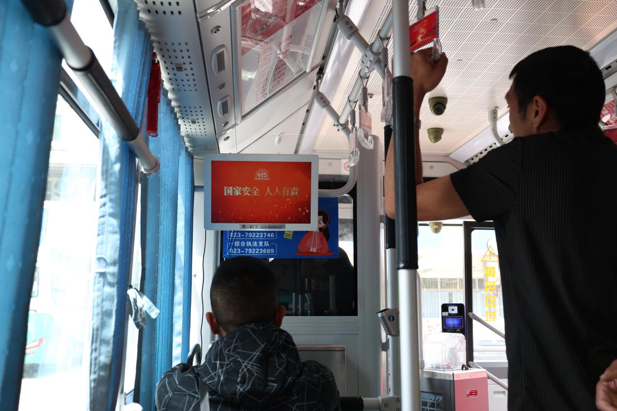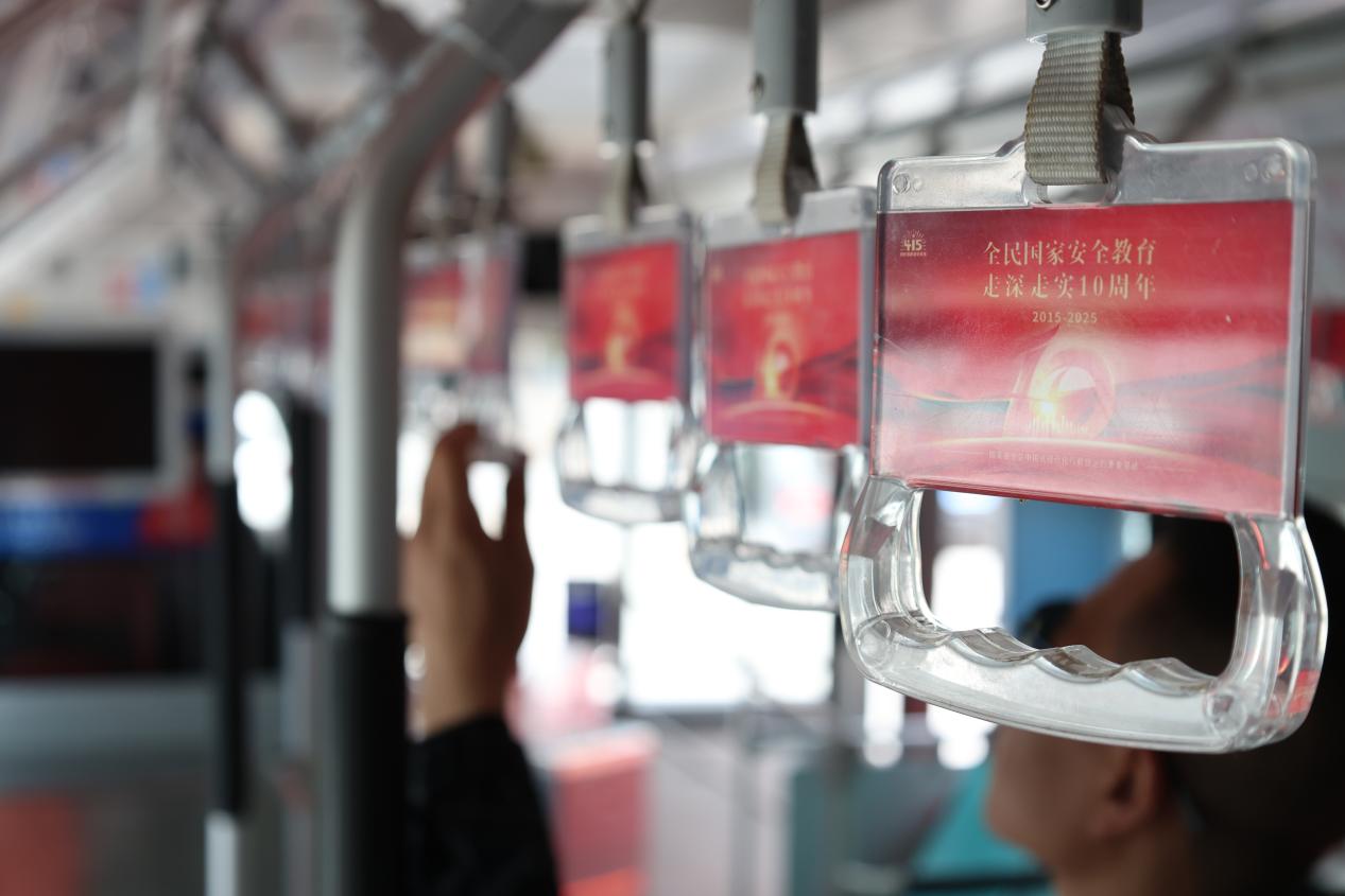 記者在“國安號”公交專線上看到,公交車車頭、車身上張貼著“爭當(dāng)紅巖先鋒·維護國家安全”“國家安全一切為了人民一切依靠人民”等宣傳標語;車內(nèi)部設(shè)置“全民國家安全教育·走深走實十周年”吊環(huán),并在車載顯示屏上滾動播放國家安全相關(guān)的宣傳教育片。