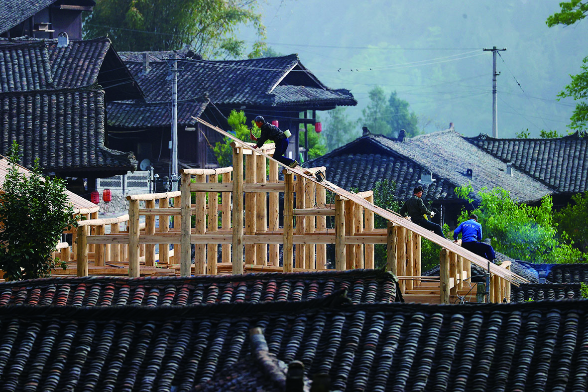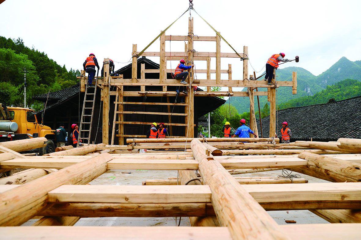 圖為4月12日,工人在葉家大院搭建吊腳樓村史館。