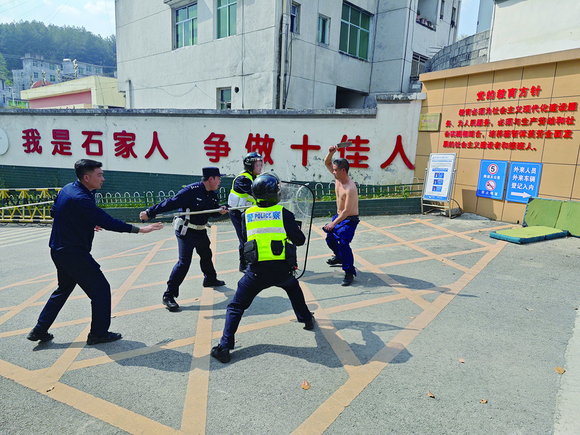 活動現場,工作人員模擬了一名患者突然發病,在石家小學持械威脅鬧事,經學校保安報警,派出所接到報警后立即向應急處置領導小組報告并迅速聯合衛生院、應急辦等部門趕赴現場,及時疏散家屬群眾,設立警戒線,成功將患者控制,并將其安全送往醫院救治。
