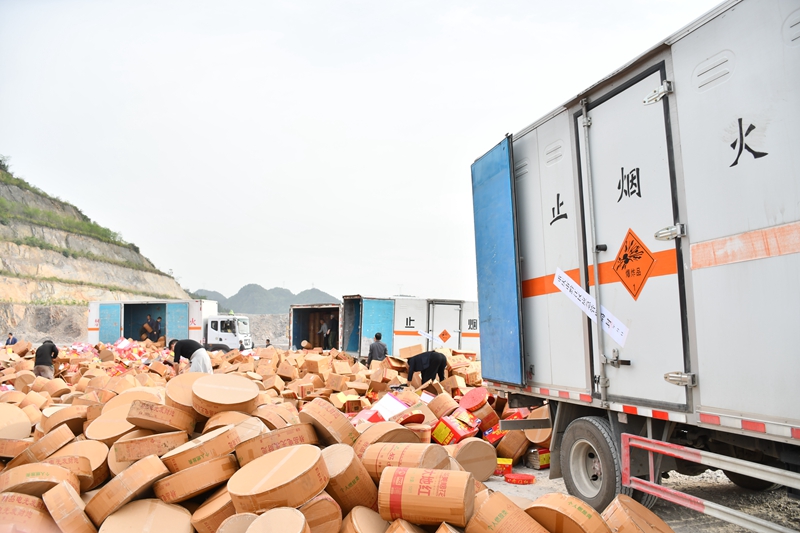 記者在位于黔江區(qū)水田鄉(xiāng)的集中銷毀現(xiàn)場看到,工作人員做好安全防范措施,將等待銷毀的非法煙花爆竹卸車拆散,經(jīng)過清點(diǎn)后,集中放置在空曠區(qū)域(如圖)。隨后,在公安、應(yīng)急管理執(zhí)法人員監(jiān)督下,專業(yè)人員采用集中焚燒和燃放兩種方式,對這批煙花爆竹進(jìn)行徹底銷毀。