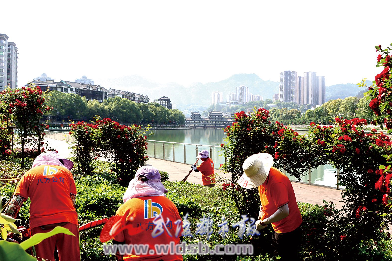 每一座城市,離不開園藝工人給城市花木的“梳妝打扮”,人們通常稱他們是城市里的“最美工匠”。5月13日,園藝工人一大早來到黔江區武陵水岸月季長廊的綠化帶里,為樹樁月季及綠化帶里種植的其它花木進行修枝造型。這些花木在“最美工匠”的精心呵護下,將城市裝點得多姿多彩。