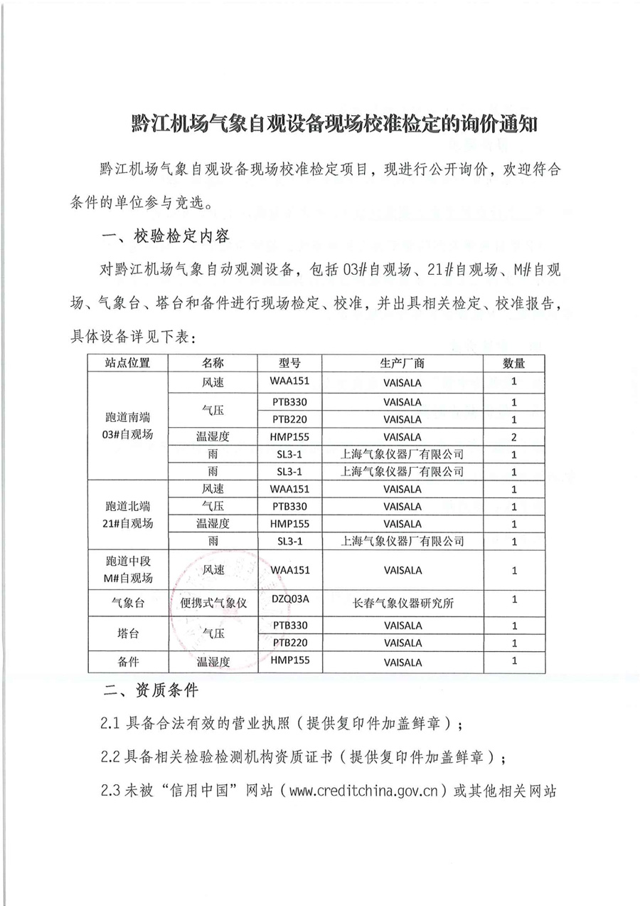 黔江機場氣象自觀設備現場校準檢定的詢價通知.pdf