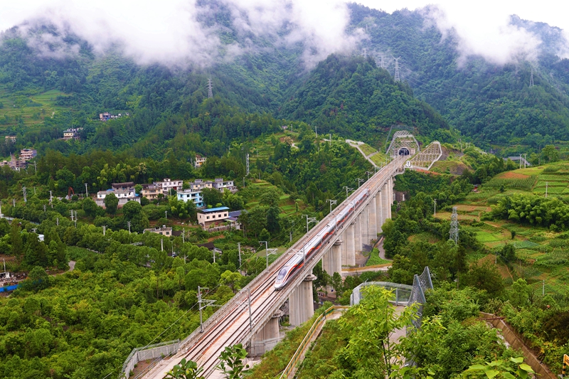 “復興號”動車組行駛在渝廈高鐵重慶東至黔江段趙家山大橋上