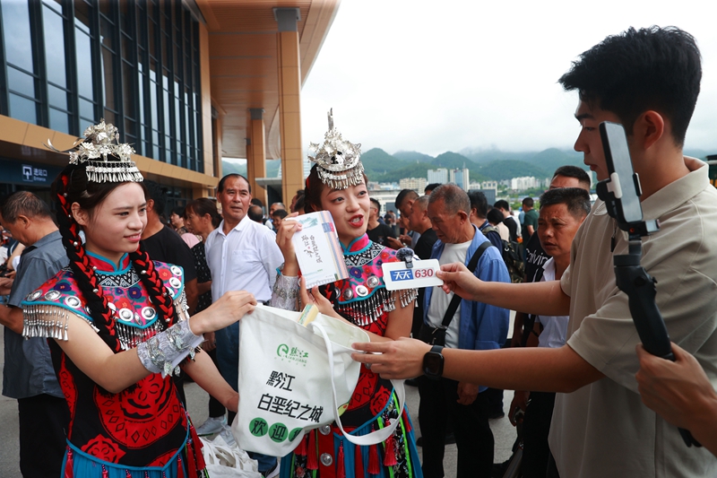 “歡迎大家來黔江!”旅客們走出車廂,隨即被歡迎的人們包圍,并收到文旅部門送上的“黔多多”恐龍吉祥物。