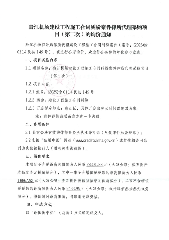 黔江機場建設工程施工合同糾紛案件律所代理采購項目(第二次)的詢價通知