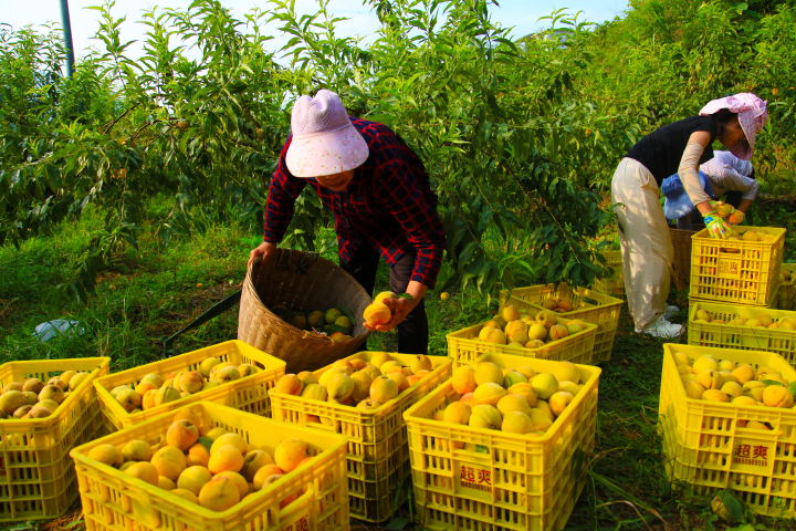 黔江區(qū)太極鎮(zhèn)新陸村在鄉(xiāng)村振興中走生態(tài)優(yōu)先、綠色發(fā)展之路,利用村集體經(jīng)濟(jì)建起100多畝生態(tài)黃桃基地,并通過春賞花、夏采果的農(nóng)旅融合模式,讓黃桃成為農(nóng)民增收的致富果。盛夏時節(jié),黃桃成熟,當(dāng)?shù)卮迕衩χ烧?yīng)市場,實(shí)現(xiàn)增收。