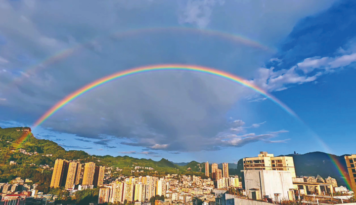 8月16日18時,一場短時降雨后,黔江城區上空呈現壯麗的雙彩虹奇觀(如圖)。兩道色彩分明的彩虹橫跨天際,與城市建筑、遠山、近水、綠樹相映成趣,在陽光照射下鮮艷奪目,吸引眾多在河濱公園散步的市民駐足觀賞,不少人舉起手機記錄這難得的美景。