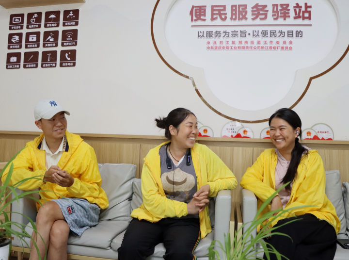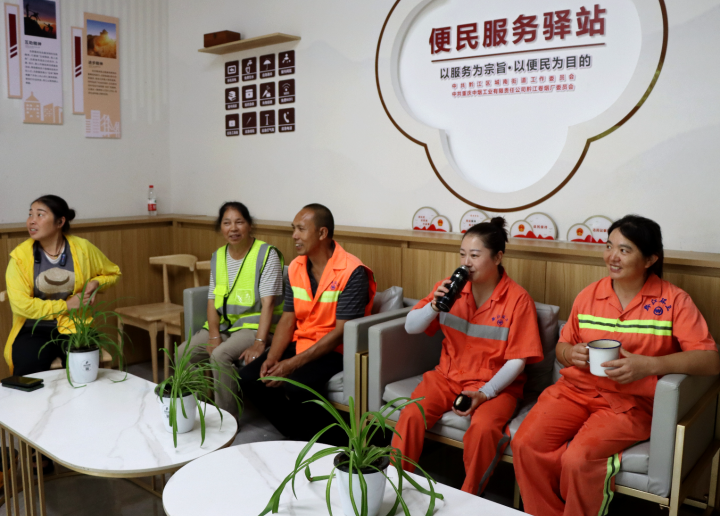 在紅心黨群服務(wù)驛站的便民服務(wù)驛站,每天都有歡聲笑語(yǔ),來(lái)這里喝茶歇涼的有城區(qū)外賣小哥小妹、環(huán)衛(wèi)工人、街道保潔員等,他們休息的間歇相聚在一起,擺談各自的家長(zhǎng)里短,傾聽行業(yè)之間的增收故事。