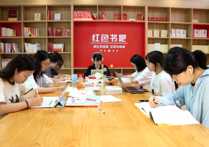 走進(jìn)驛站,里面寬敞明亮的公益書屋和紅色書吧,2張長(zhǎng)形方桌周圍,坐滿了自習(xí)的大學(xué)生。