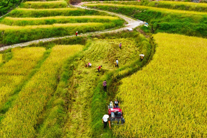 9月7日,農機手操作小型收割機在黔江區馮家街道寨子社區收獲水稻。當天是二十四節氣的白露。白露時節,黔江區的水稻次第成熟,農民們抓住農時,搶收、搶曬,確保顆粒歸倉,實現增收。