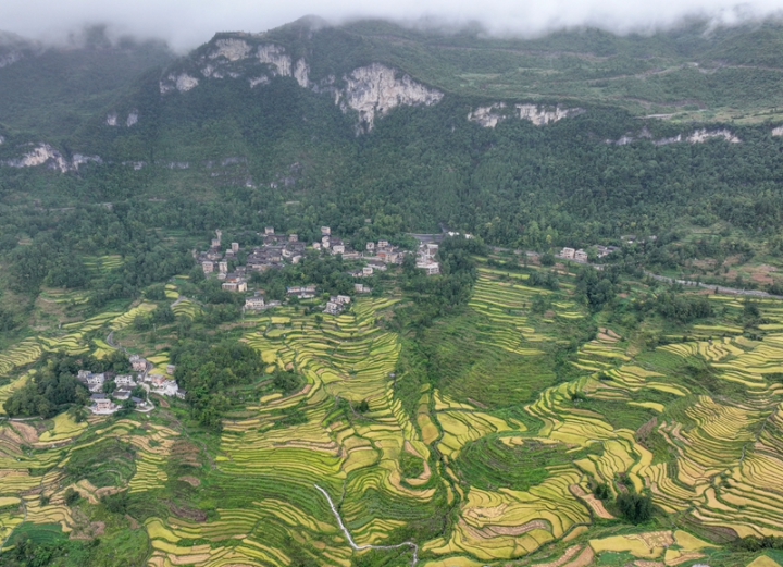 9月10日拍攝的重慶市酉陽土家族苗族自治縣花田鄉何家巖村梯田景色(無人機照片)。