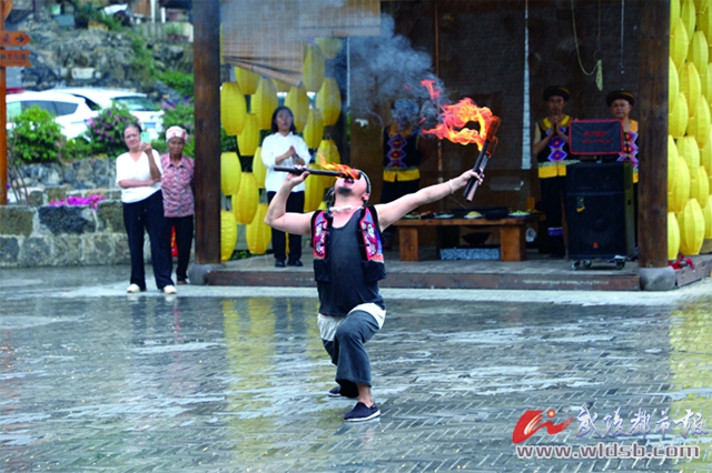 不遠處的休閑演藝區則是另一番熱鬧景象,三棒鼓藝人甩動木棒敲出清脆節奏,木葉情歌的調子婉轉悠揚,噴火表演引得圍觀游客陣陣驚呼(如圖)。