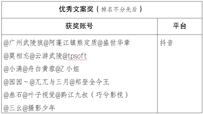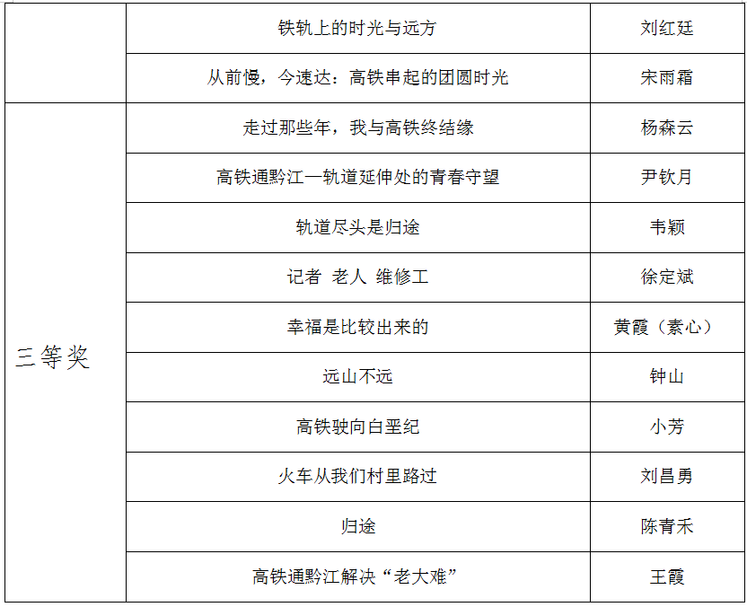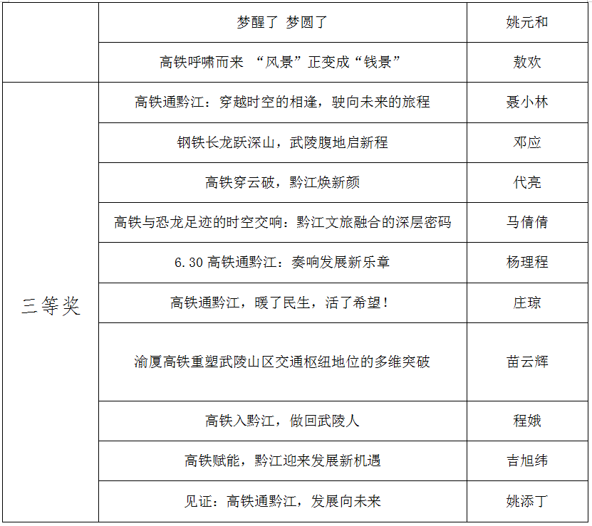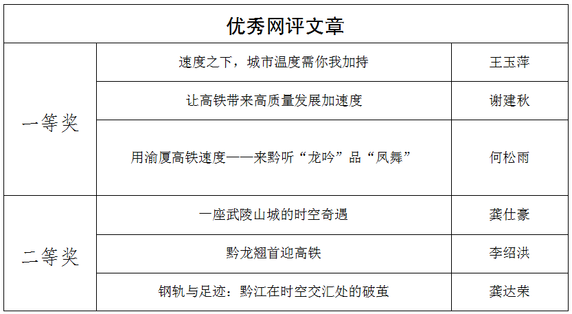 “我看6.30 高鐵通黔江”主題征文活動自啟動以來,得到了社會各界的廣泛關注與積極參與。經綜合網絡傳播數據和專家評審意見,評選出優秀網評、優秀小故事一、二、三等獎各3名、5名、10名,優秀文案獎及參與獎若干,現將獲獎名單公布如下。