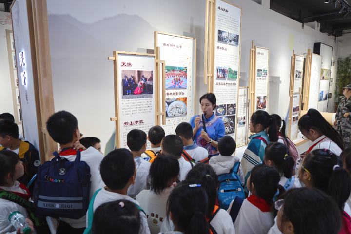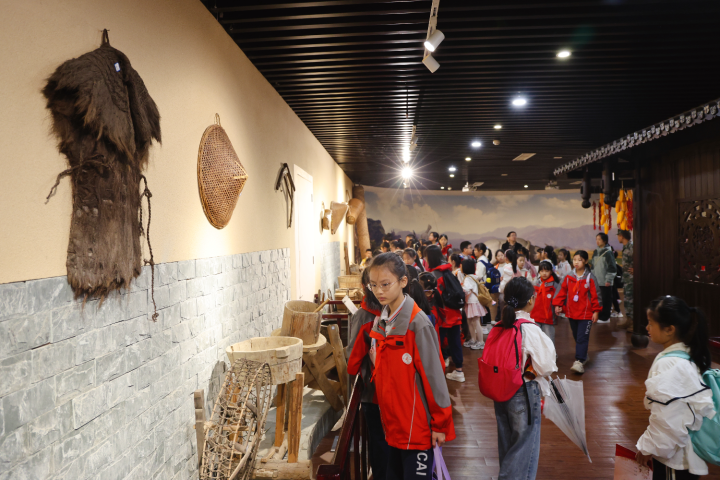 “這套苗族盛裝重達20斤,是姑娘出嫁時的‘鎧甲’!”講解員話音未落,男生們紛紛咋舌。當得知苗銀鍛造需經1200次捶打,人群中響起掌聲。在“黔江民族融合史”展區,一張1952年漢族醫生為土家族產婦接生的老照片前,育才小學帶隊教師現場開起微課堂:“看!七十多年前的‘石榴籽’就是這樣緊緊相擁。”